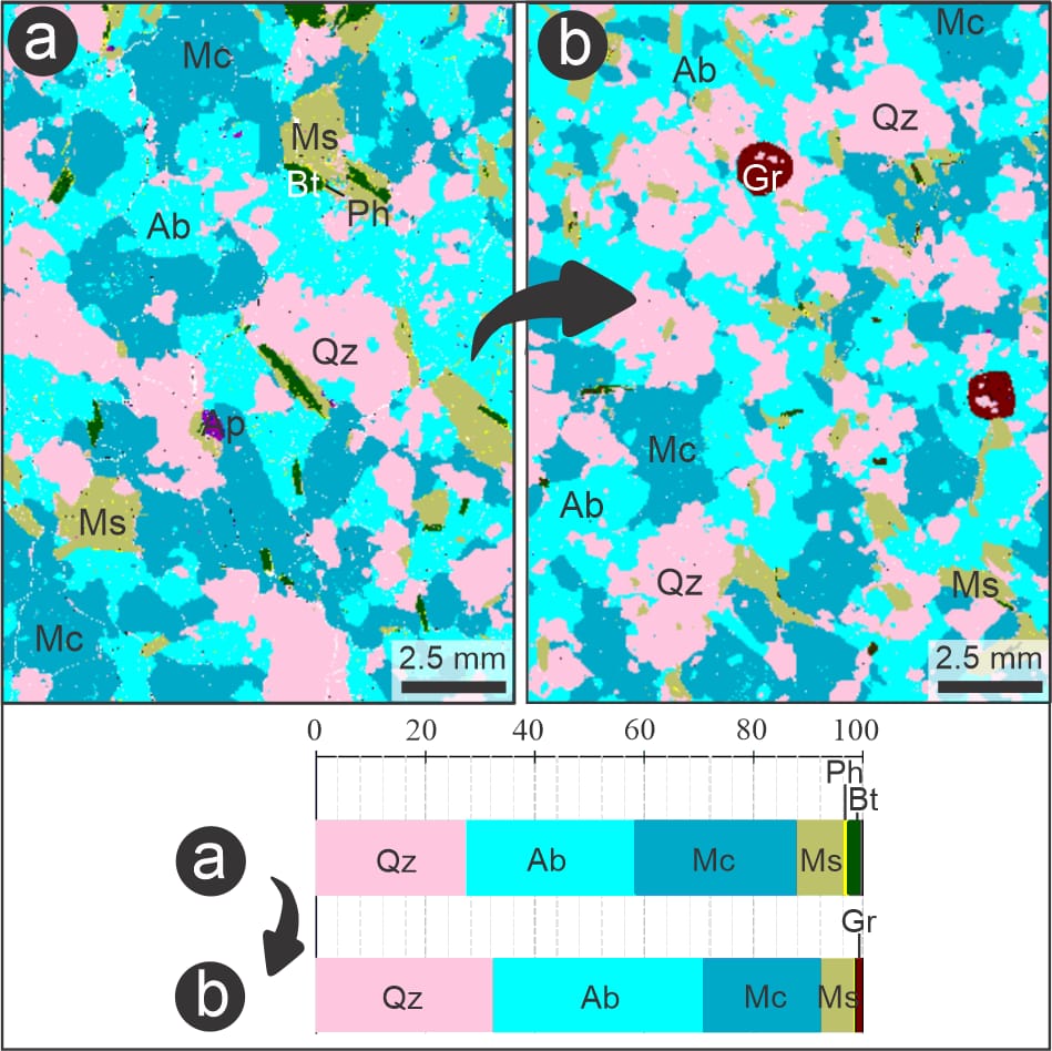 EN | Late-magmatic fluid induced alteration is outstandingly marked in the Itaporé batholith rocks: This evolution in the alteration degree is evidenced by siderophyllite (Bt) to phengite (Ph) to muscovite (Ms) transitions. The intense degree of alteration in the two-mica granite (a) and the muscovite leucogranite (b) result in a significant deviation from the parental biotite granite composition, where secondary minerals are incipient and conspicuous. Mineral maps by TIMA. Contribution by the PhD student Carolina Deluca from UFMG.