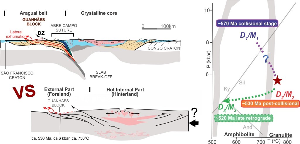 EN | For far too long has the Guanhães Block been viewed as an empty square in the evolutionary models of the Araçuaí-West-Congo Orogen. A new publication in Gondwana Research uses petrochronological strategies with dating of multiple mineral phases, traditional thermobarometry and phase-diagram modeling to understand the conditions in which the main pervasive foliation was developed. The result is a surprising and unique record of widespread low pressure and high temperature metamorphism. Quite different to the traditional high pressure metamorphism of the Araçuaí Belt. What does that mean for the history of the orogen? See at https://doi.org/10.1016/j.gr.2022.03.012.